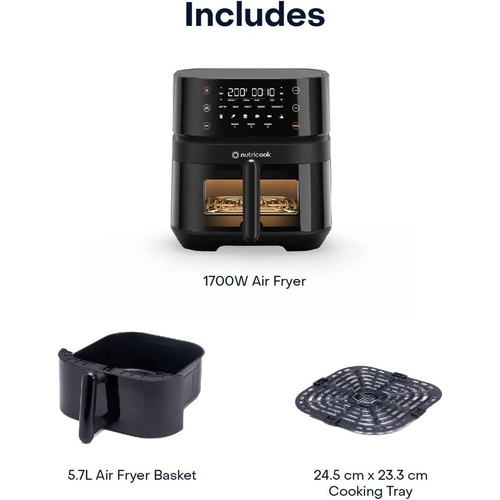 معرفی سرخ کن نوتریکوک مدل AF357 سرخ کن نوتریکوک مدل AF357 محصولی باکیفیت ساخت بالا، توان 1700 وات، دارای قابلیت های پیشرفته با ظرفیت 5.7 لیتر برای خانواده های با جمعیت متوسط و 5 نفره مناسب می باشد. این سرخ کن با پخت مواد غذایی توسط حرارت بدون استفاده از روغن امکان آشپزی سالم تر و حتی آسان تری را فراهم کرده است. ویژگی های سرخ کن بدون روغن نوتریکوک مدل AF357 سرخ کن بدون روغن نوتریکوک مدل AF357 دارای 11 برنامه پخت پیش فرض است. 5 برنامه اصلی شامل سرخ کردن، پختن، رست کردن (برشته کردن، تفت دادن) گرم کردن مجدد و خشک کردن مواد غذایی می باشد. 6 برنامه دیگر مربوط به سرخ کردن سیب زمینی، مرغ، همبرگر، استیک، ماهی و سمبوسه است. علاوه بر برنامه های پیش فرض، وجود 3 برنامه با تنظیمات و پخت دلخواهتان این سرخ کن را جذاب تر کرده است. با این ویژگی 3 دستور غذای مورد علاقه خود را برای دسترسی راحت تر با یک لمس سفارشی و ذخیره کنید. از دیگر ویژگی های سرخ کن nutricook af357 می توان به تنظیمات دما و زمان پخت، گردش هوای داغ درون محفظه، پخت آرام و کم صدا تنها با 55 دسیبل، حالت پیش گرمایش، نشانگر یادآوری تکان دادن (هم زدن غذای درون سبد)، پخت یکنواخت و تُرد غذا اشاره کرد. طراحی ظاهری بدنه سرخ کن نوتریکوک مدل AF357 با طراحی شیک و مدرن به رنگ مشکی، زیبایی منحصر به فردی را به محیط آشپزخانه تان خواهد بخشید. بالای بدنه صفحه نمایشگر دیجیتالی با دکمه های لمسی طراحی شده که در کنار کاربری ساده به جذابیت ظاهری محصول افزوده است. درب سرخ کن دارای پنجره ای بوده که در کنار نوردهی داخلی، امکان مشاهده داخل محفظه حین پخت را فراهم می کند. بنابراین نیاز نیست سبد دستگاه را مدام بیرون بکشید تا میزان پخت و سرخ شدن مواد غذایی را بررسی کنید. محفظه داخلی سرخ کن به شکل مستطیل و از جنس روکش نچسب بوده که اجازه نمی دهد مواد غذایی به ظرف بچسبند. نحوه باز شدن محفظه و سبد سرخ کن به صورت کشویی طراحی شده و دستگیره آن در برابر حرارت عایق خوبی می باشد. تمیز کردن این دستگاه بسیار آسان است. سبد و سینی قابل جدا شدن هستند و می توان به راحتی آنها را در ماشین ظرفشویی قرار داده و شست.